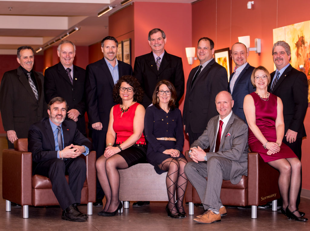 Debout : Bernie Leger (Scoudouc Industrial Park), Paul Boudreau (Conseil municipal), John Mazerolle (Pizza Delight), Mario Savoie (Sobeys), Pierre Cormier (Kent Building Supplies), Steve Bossé (Roy Byrns & associates), Danny Pellerin (Ville de Shediac)